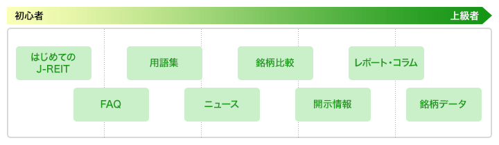 J-REIT初心者でも各コンテンツについてご理解いただけるように右のような「初心者マーク」を設定しています。初心者マークをクリックすると各コンテンツの使い方や、情報の見方などについて説明が表示されます。