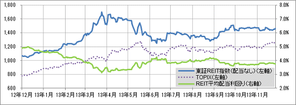 <東証 REIT 指数と予想配当利回りの推移> (グラフは 2012年 12 月~2013 年 11 月の 12 ヶ月間)