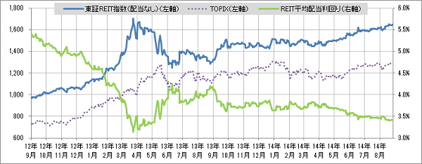 <東証REIT指数と予想分配金利回りの推移> (グラフは2012年9月~2014年8月の24ヶ月間)