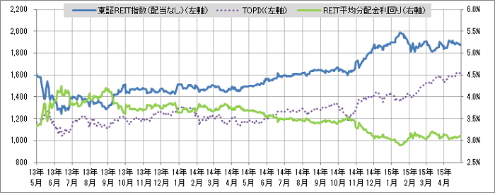 <東証REIT指数と予想分配金利回りの推移> (グラフは2013年5月~2015年4月の24ヶ月間)