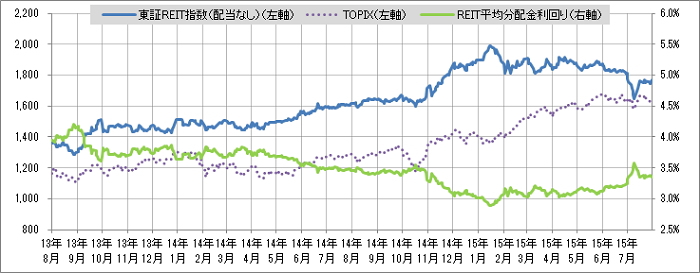 <東証REIT指数と予想分配金利回りの推移> (グラフは2013年8月~2015年7月の24ヶ月間)