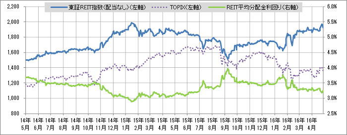 <東証REIT指数と予想分配金利回りの推移> (グラフは2014年5月~2016年4月の24ヶ月間)