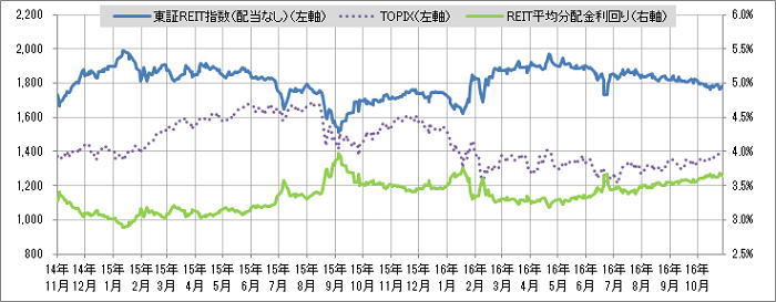 <東証REIT指数と予想分配金利回りの推移> (グラフは2014年11月~2016年10月の24ヶ月間)