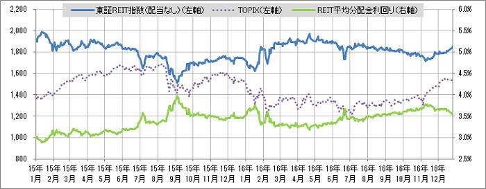 <東証REIT指数と予想分配金利回りの推移> (グラフは2015年1月~2016年12月の24ヶ月間)