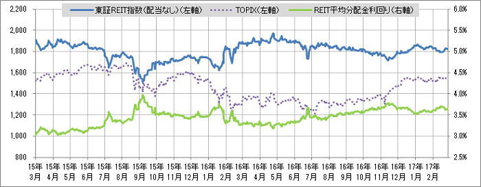<東証REIT指数と予想分配金利回りの推移> (グラフは2015年3月~2017年2月の24ヶ月間)
