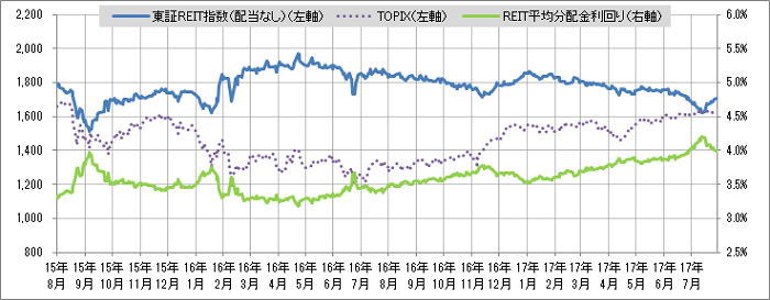 <東証REIT指数と予想分配金利回りの推移> (グラフは2015年8月~2017年7月の24ヶ月間)