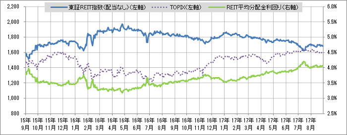 <東証REIT指数と予想分配金利回りの推移> (グラフは2015年9月~2017年8月の24ヶ月間)
