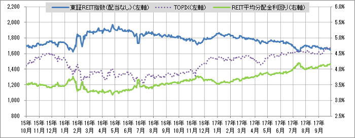 REIT指数と予想分配金利回りの推移>  (グラフは2015年10月~2017年9月の24ヶ月間)