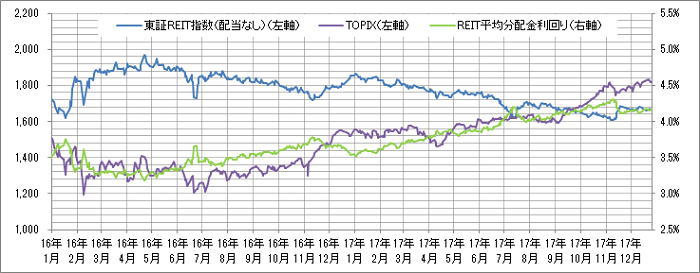 <東証REIT指数と予想分配金利回りの推移> (グラフは2016年1月~2017年12月の24ヶ月間)