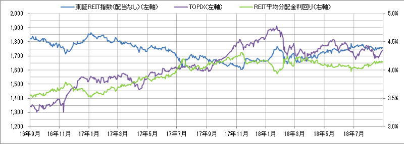 <東証REIT指数と予想分配金利回りの推移> (グラフは2016年9月~2018年8月の24ヶ月間)