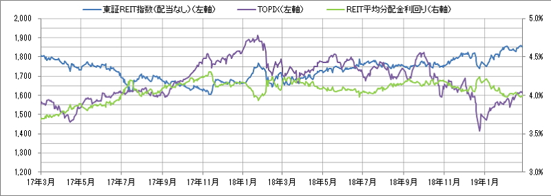 <東証REIT指数と予想分配金利回りの推移> (グラフは2017年3月~2019年2月の24ヶ月間)
