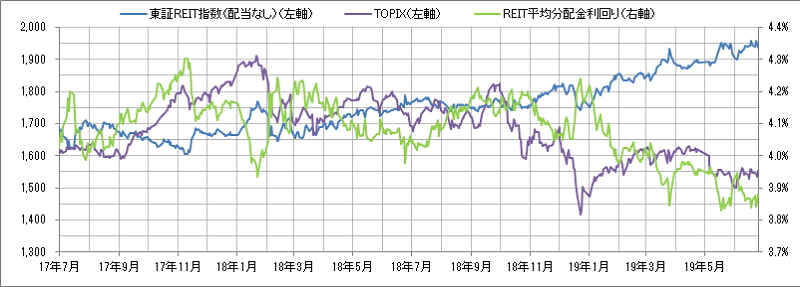 <東証REIT指数と予想分配金利回りの推移> (グラフは2017年7月~2019年6月の24ヶ月間)