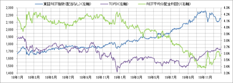 <東証REIT指数と予想分配金利回りの推移> (グラフは2018年1月~2019年12月の24ヶ月間)