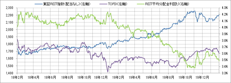 <東証REIT指数と予想分配金利回りの推移> (グラフは2018年2月~2020年1月の24ヶ月間)