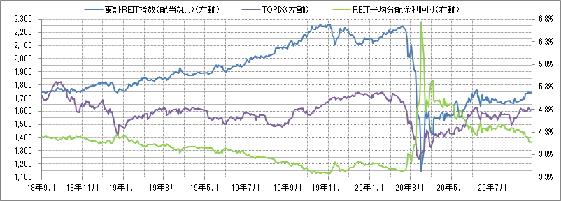 <東証REIT指数と予想分配金利回りの推移> (グラフは2018年9月~2020年8月の24ヶ月間)