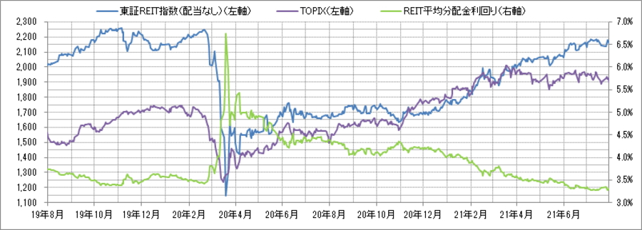 <東証REIT指数と予想分配金利回りの推移> (グラフは2019年8月~2021年7月の24ヶ月間)