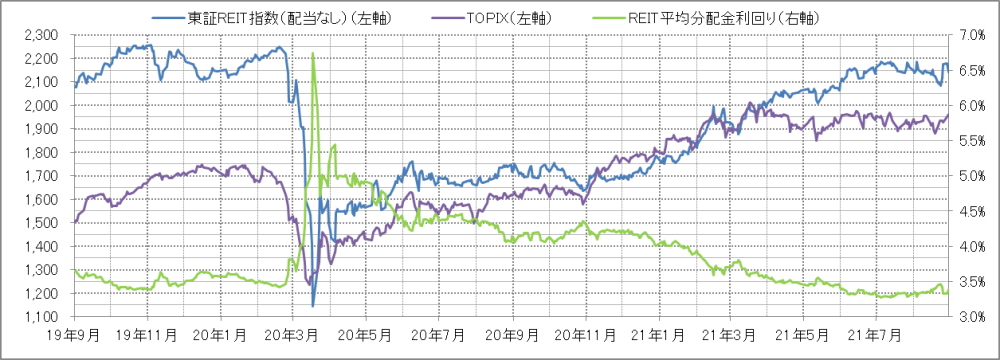 <東証REIT指数と予想分配金利回りの推移> (グラフは2019年9月~2021年8月の24ヶ月間)