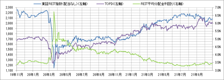 <東証REIT指数と予想分配金利回りの推移> (グラフは2019年11月~2021年10月の24ヶ月間)