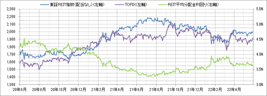 <東証REIT指数と予想分配金利回りの推移> (グラフは2020年6月~2022年5月の24ヶ月間)