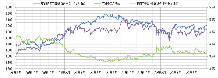<東証REIT指数と予想分配金利回りの推移> (グラフは2020年8月~2022年7月の24ヶ月間)