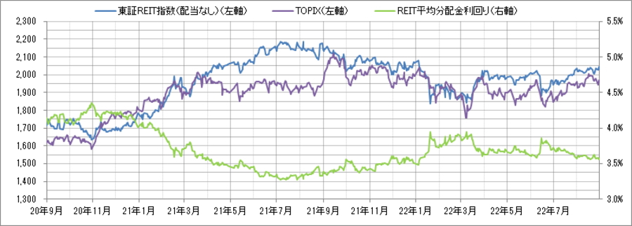 <東証REIT指数と予想分配金利回りの推移> (グラフは2020年9月~2022年8月の24ヶ月間)