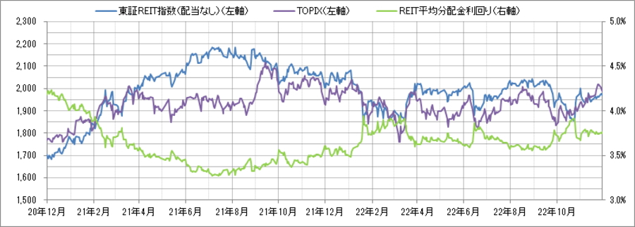 <東証REIT指数と予想分配金利回りの推移> (グラフは2020年12月~2022年11月の24ヶ月間)