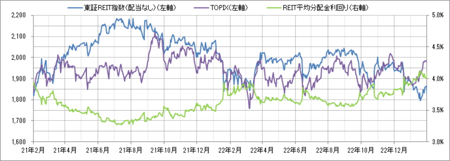 <東証REIT指数と予想分配金利回りの推移> (グラフは2021年2月~2023年1月の24ヶ月間)