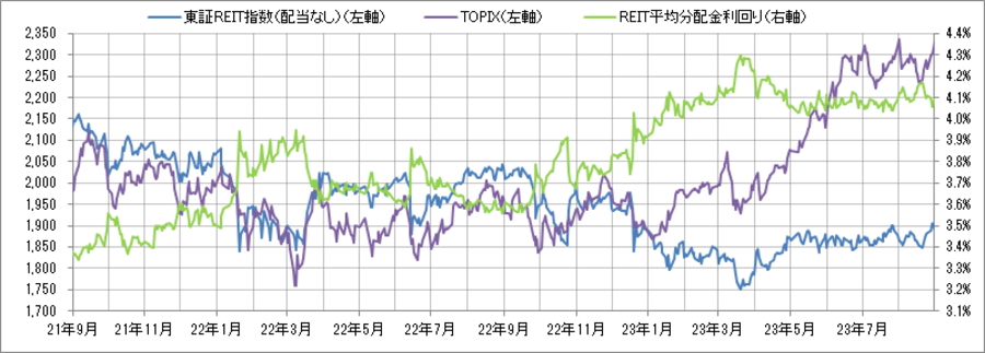 <東証REIT指数と予想分配金利回りの推移> (グラフは2021年9月~2023年8月の24ヶ月間)