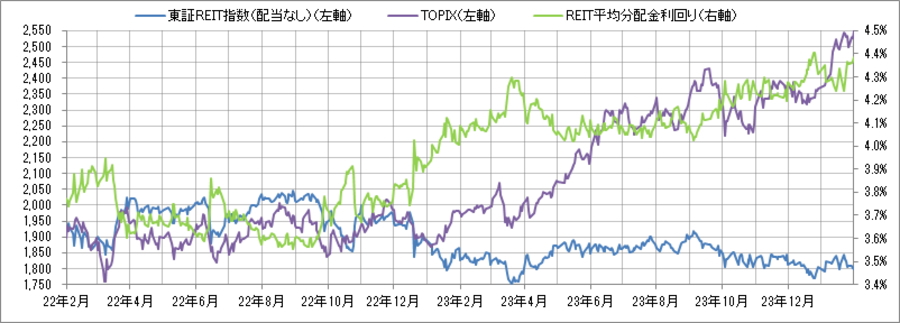<東証REIT指数と予想分配金利回りの推移> (グラフは2022年2月~2024年1月の24ヶ月間)