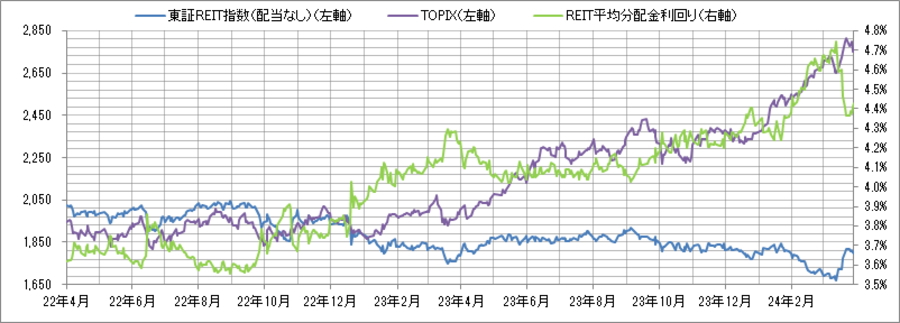 <東証REIT指数と予想分配金利回りの推移> (グラフは2022年4月~2024年3月の24ヶ月間)