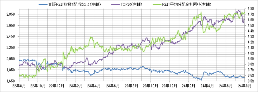 REIT指数と予想分配金利回りの推移>  (グラフは2022年8月~2024年7月の24ヶ月間)