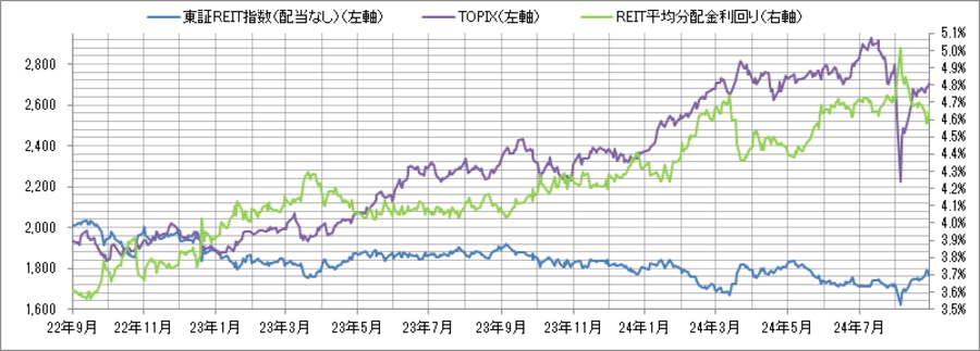 <東証REIT指数と予想分配金利回りの推移> (グラフは2022年9月~2024年8月の24ヶ月間)
