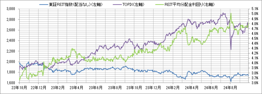 <東証REIT指数と予想分配金利回りの推移> (グラフは2022年10月~2024年9月の24ヶ月間)