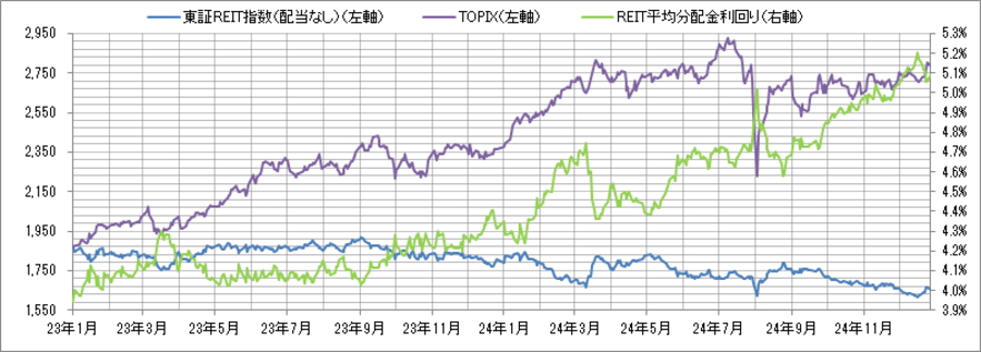 <東証REIT指数と予想分配金利回りの推移> (グラフは2023年1月~2024年12月の24ヶ月間)