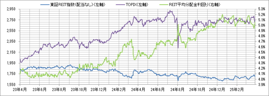 <東証REIT指数と予想分配金利回りの推移> (グラフは2023年4月~2025年3月の24ヶ月間)