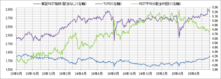 REIT指数と予想分配金利回りの推移>  (グラフは2023年8月~2025年7月の24ヶ月間)