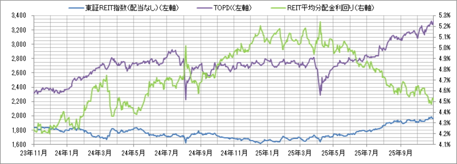 <東証REIT指数と予想分配金利回りの推移> (グラフは2023年11月~2025年10月の24ヶ月間)