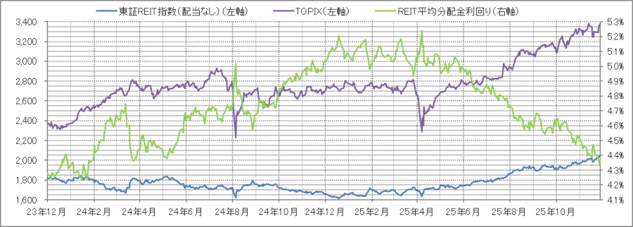<東証REIT指数と予想分配金利回りの推移> (グラフは2023年12月~2025年11月の24ヶ月間)