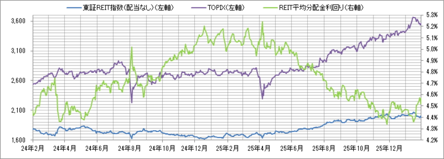 REIT指数と予想分配金利回りの推移>  (グラフは2024年2月~2026年1月の24ヶ月間)