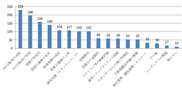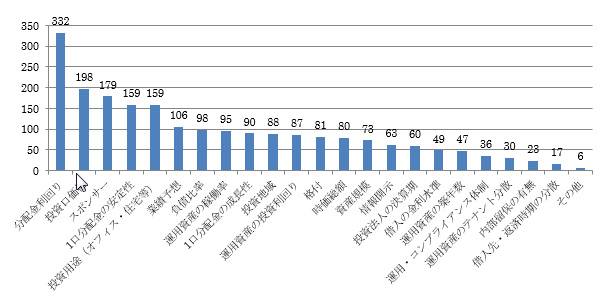 今後J-REIT投資をするために期待する内容として、「1口分配金の成長」が「1口分配金の安定」を上回っており、昨年から逆転している。特にオフィスビル系銘柄の分配金水準が未だ低いことから、アベノミクスによる景気回復期待の表れと捉えられる。次いで「財務の安定性」「投資口価格の安定」と続く点から、成長を期待しつつも、その前提として従来同様に安定性を求める声が多い。