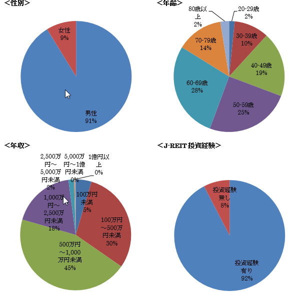 性別では、男性が全体の91%と大部分を占めるものの、昨年比5%増と女性の割合が増加している。年齢別では、資金力が高いと想定される50~60代が半数を占め、退職後の資産運用に対する意識の高さが伺える。また70代が昨年より僅かに増加する一方、30代が昨年より4%減少している点から、個人投資家の年齢層が上がっている点が挙げられる。年収別では、500万円~1,000万円のカテゴリが全体の45%を占める。REITの投資経験の有無については、回答者の92%がREIT投資経験を持つ。