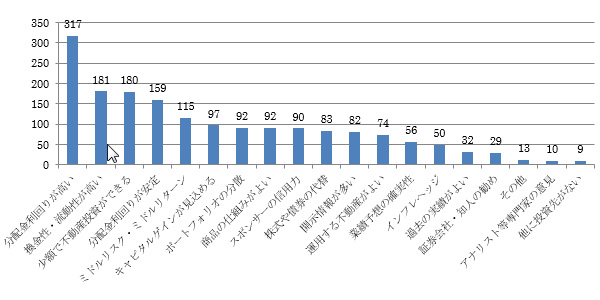 J-REIT未経験の回答者が、投資しない理由として「資金不足」を一番に挙げる。昨年までは「REIT市況の懸念」の割合も高かった点から見ると、REIT市況の懸念材料は薄れたものの、資金不足を理由に投資出来ないと想定される。また次点に、「REIT組入れの投資信託・ETFに投資」「銘柄の違いが分からない」が位置することから、銘柄の違いが分からない理由から、個別銘柄よりも分散投資、少額投資が出来るREIT投信やREIT-ETFを支持する層も存在する。