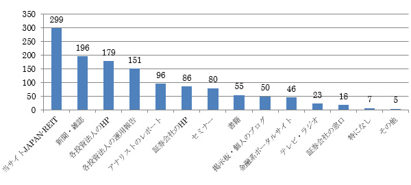 本アンケートをJAPAN-REITサイト上で行っている経緯もあり、日々の投資情報入手方法として、REIT全銘柄を横断的に取り扱う本サイト「JAPAN-REIT」を参考とする投資家が全体の70%を占める。新規銘柄の上場や投資口価格の活況、日銀の買入れ等によりメディアに登場する機会も増えたことから、「新聞や雑誌」の利用が高い点が顕著になっている。