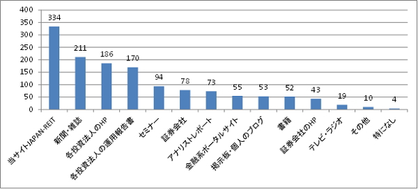 本アンケートを行っている経緯もあり、REIT全銘柄を横断的に取り扱う本サイト「JAPAN-REIT.COM」を参考とする投資家が74%と高い割合を示す。その他、投資家のアクションとして「各投資法人のサイト」へアクセスしたり、決算毎に投資家に送られる「各投資法人の資産運用報告書」も活用されている。個人にも分かりやすく読みやすい点が評価されるポイントと考えられる。