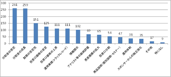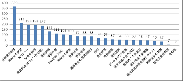 昨年は、アベノミクス期待から3月に東証REIT指数が1,700ポイント超と急上昇した結果、キャピタルゲインを期待し「投資口価格」が2番目に挙がったが、今年は投資口価格が安定していることから、「投資口価格」のランクが低下した。このように投資口価格の推移によって、銘柄選択の仕方や指標が変化する点が窺える。