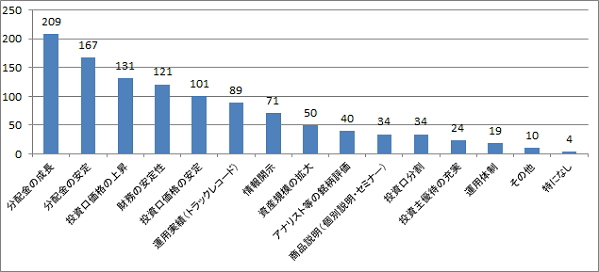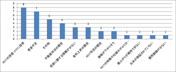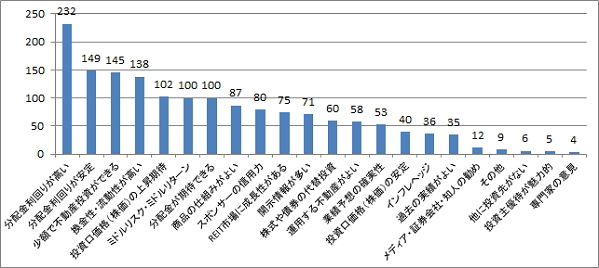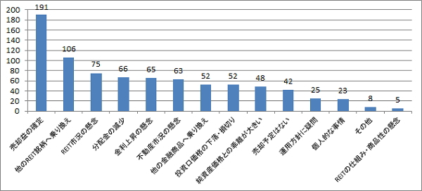 「投資口価格の売却益」が、売却する理由としてを最も多い。月間の投資口売買動向によれば、個人投資家はほぼ売越し主体となっており、その背景には、インカムゲイン投資としての魅力から長期投資を想定して投資を始めるが、投資口価格が上昇すればキャピタルゲインの魅力の方が上回るという意識が見て取れる。更に売却後はより分配金利回りの高い「他のREIT銘柄」へ資金を移動する動きも推測される。また、「分配金の減少」より「REIT市況の懸念」の回答数が昨年と逆転した背景には、賃貸市況の改善から分配金の減少リスクは減少する一方、不安定な投資口価格を受け、投資口市況への懸念材料が高まっていると見られる。