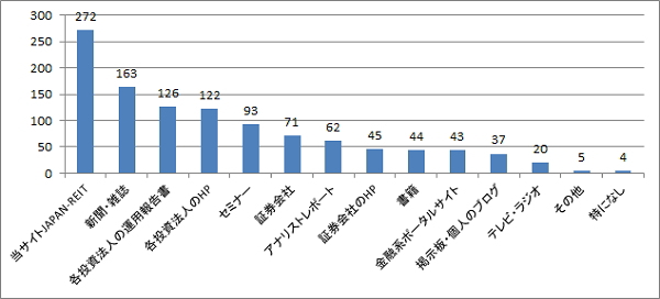 本アンケートを行っている経緯から、本サイト「JAPAN-REIT.COM」を参考とする投資家が77%と高い割合を示す。また、決算毎に投資家に送られる「各投資法人の資産運用報告書」が36%と比較的高い数字を示している点から、資産運法報告書が個人投資家への重要なツールとなっている。即効性の高いWEBは便利で重要度も高いが、手元に送られる資料は投資家がじっくり目を通してREITを理解する貴重な媒体となっている。