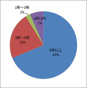 投資期間を「5年以上」とする割合が69%と、昨年の62%から7%増加、一昨年前の55%と比較すると14%増加し、REIT投資期間の長期化の傾向が高まっている。