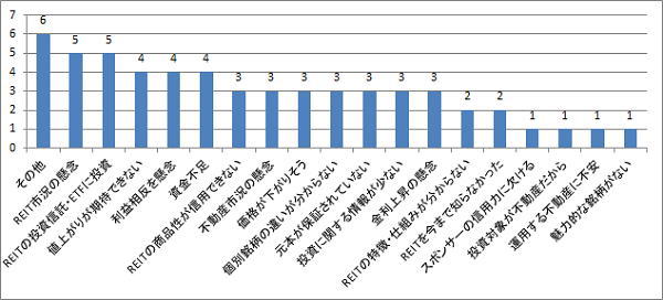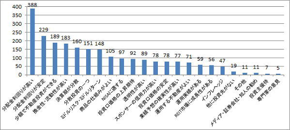 投資しない理由として突出するものはなく、大別すると、個別銘柄が選択出来ないため投資信託やETFに分散投資する、市況に対する懸念、利益相反等のREITの仕組みに対する懸念の3つに分類できる。