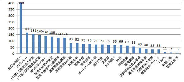 また「決算期が分散」が昨年よりランクアップした。決算期が分散しているREITの特徴が投資家に受け入れられている。REIT銘柄数が61まで増加したことから、投資家が決算期を分散して投資する余地が拡大したことも一因と言えよう。